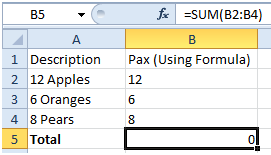 When we try to sum up the 3 numbers in (B2:B4), it returns zero. This is because Excel treated them as Text and not numbers.